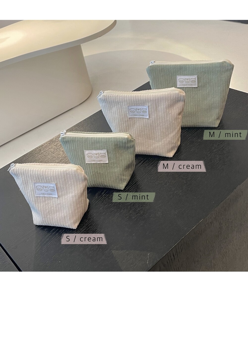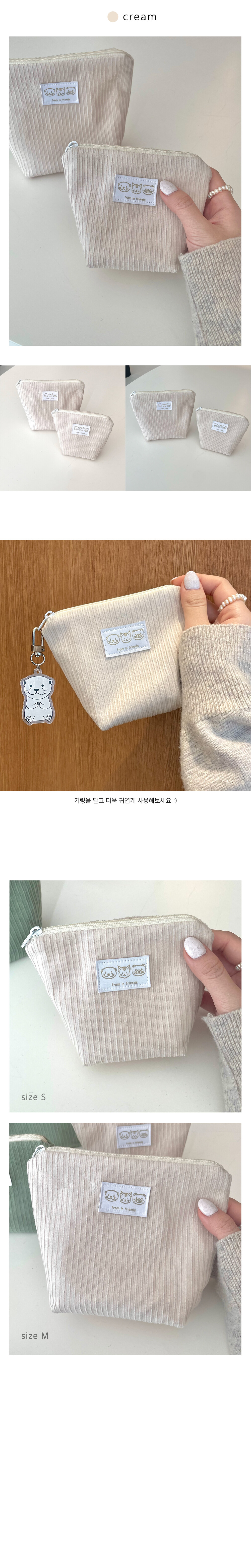 보들보들 따뜻한 코듀로이 원단에 프롬인프렌즈 라벨이 박음질 된 지퍼파우치입니다.